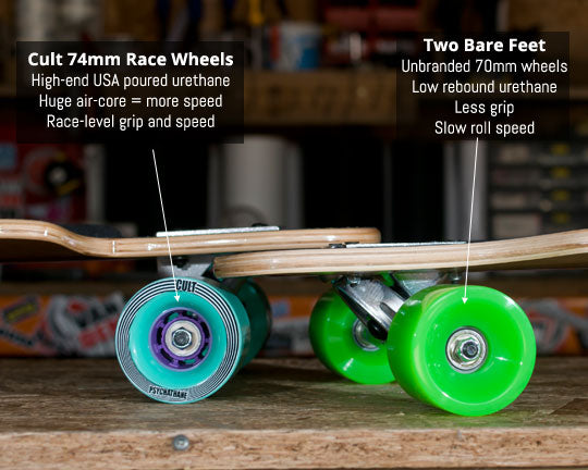 The Two Bare Feet, on the other hand, comes with unbranded wheels, with a very small core, poured from low rebound urethane.
