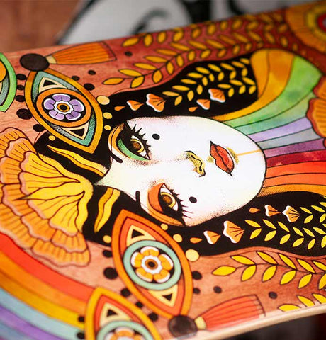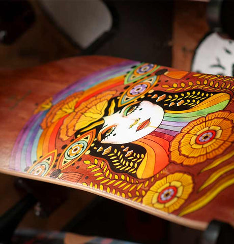 Some nice extra touches include the recycled glass re-grit surface, rather than griptape, and gold-finish hardware, washers and kingpins - classy!