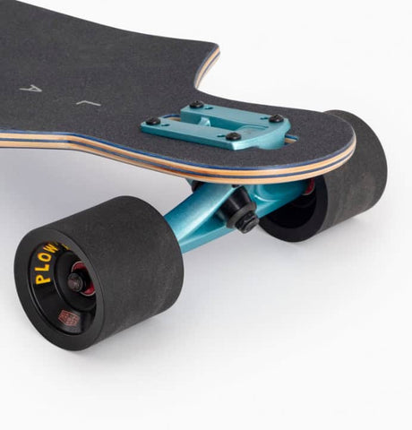 The fat Plow King wheels are a soft urethane with a square lip and no core for super juicey smooth riding. And then they took it a step further by stone grinding the finish. There's a fine line between genius and madness and this wheel brazenly treads it. It offers all the comfort of a smooth grip wheel that when pushed sideways - and you will push it - will slide out with a forgiving pffffft.