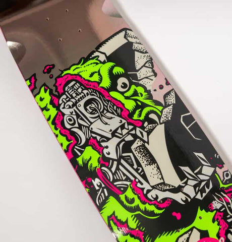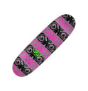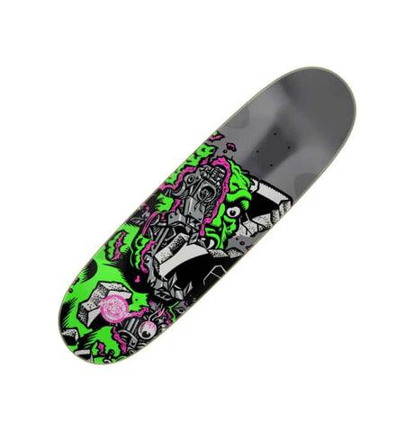 Santa Cruz Roskopp Macro - an all new 9" egg shape with wheel wells with gunmetal foil graphics, pressed in the light, poppy VX deck construction.
